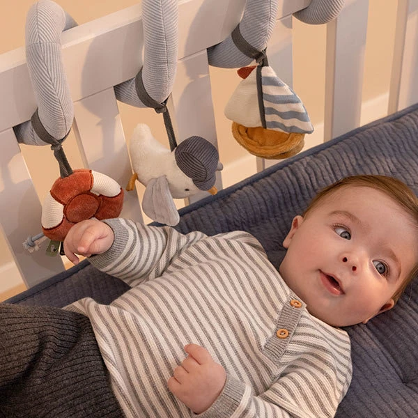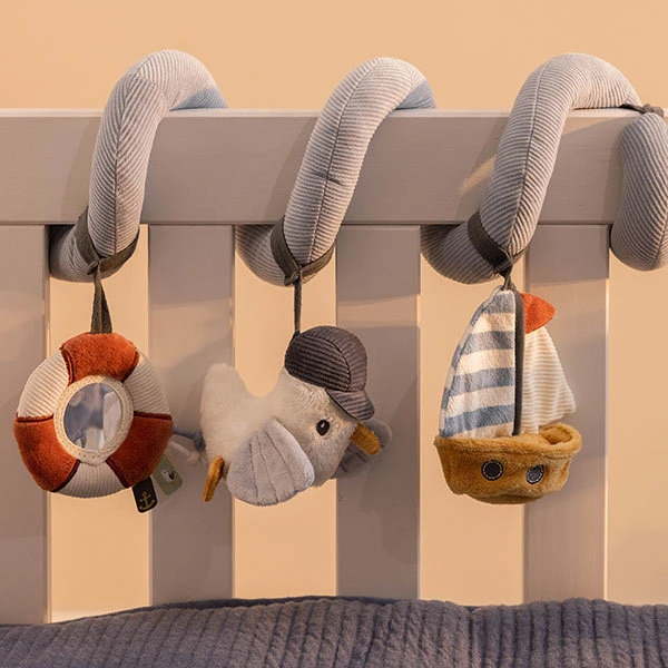 Deze boxspiraal Sailors Bay is super leuk babyspeelgoed. Jouw baby zal er vast gek op zijn. Er is ook zoveel te beleven: een spiegeltje, een rammelaar, een knijptoetertje. De speelspiraal kan eenvoudig bevestigd worden aan de box of aan de beugel van de kinderwagen. Dit speelgoed zorgt niet alleen voor veel speelplezier en vermaak, maar stimuleert tevens de hand-oogcoördinatie.