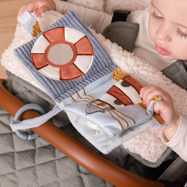 Met buggyboekje Sailors Bay beleeft je kindje veel plezier aan het ontdekken van de verschillende materialen en activiteiten in het babyboekje. Het buggyboekje knispert, bevat een knijptoeter en spiegel. Ideaal voor het prikkelen van de zintuigen en de ontwikkeling van de hand-oogcoördinatie. Je bevestigd het eenvoudig aan de buggy.