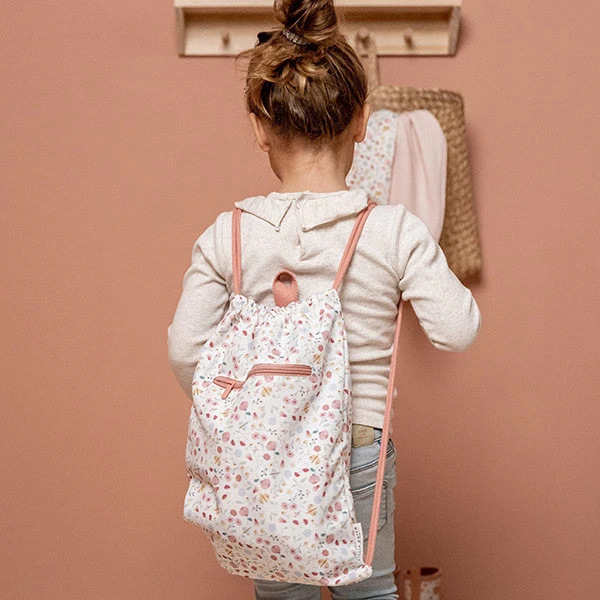 Deze leuke gymtas met Flowers en Butterflies design van Little Dutch is handig voor het meenemen en bewaren van je gym- en zwemkledij. Het rugzakje is gemaakt van gerecycleerde PET-flessen, heeft een vakje met ritssluiting aan de voorkant, een ophanglus en handige dubbele trekkoorden zodat je de gymtas makkelijk kan dragen. Binnenin vind je een label om je contactgegevens te noteren.
