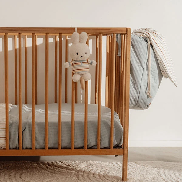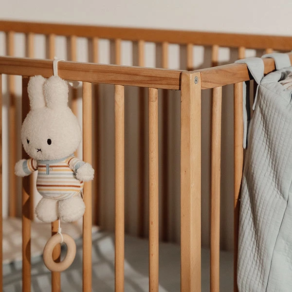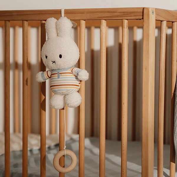Als deze Nijntje muziekdoos Vintage Sunny Stripes een liedje voor je kindje speelt zal het helpen om te kalmeren, ontspannen en in slaap te vallen. Trek aan het touwtje en Nijntje begint te zingen. De muziekdoos is makkelijk te bevestigen aan de box, het ledikant of de dressoir. Maar houd dit Nijntje altijd buiten bereik van je kleintje.
