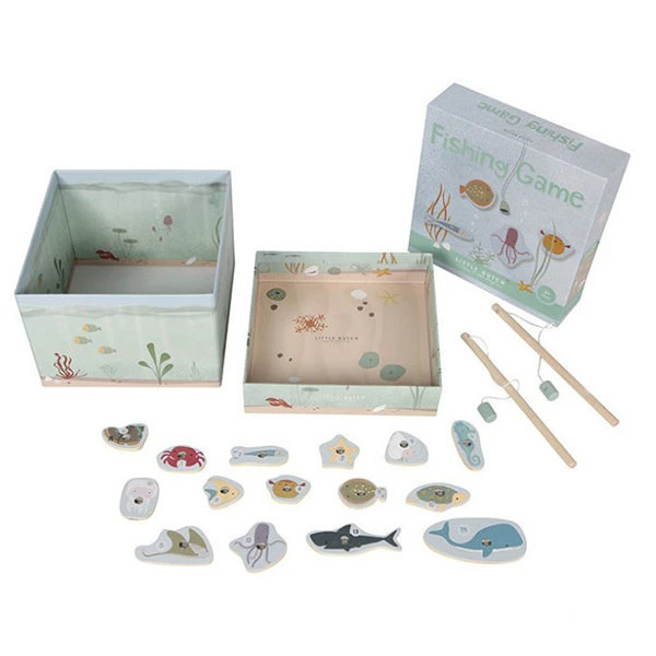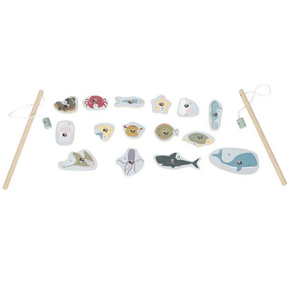 Mooi visspel met houten hengels en figuren. Vang jij de meeste onderwaterdieren met dit leuke hengelspel? Pas wel op dat je niet de oude schoen aan jouw hengel krijgt! Dit klassieke visspel stimuleert de fijne motoriek en de concentratie van kinderen. Bovendien kan het spelniveau aangepast worden aan de leeftijd van de spelers, zodat zowel jonge als oudere kinderen er veel plezier aan beleven. De onderwaterdieren zijn van hout gemaakt en het aquarium is van karton.